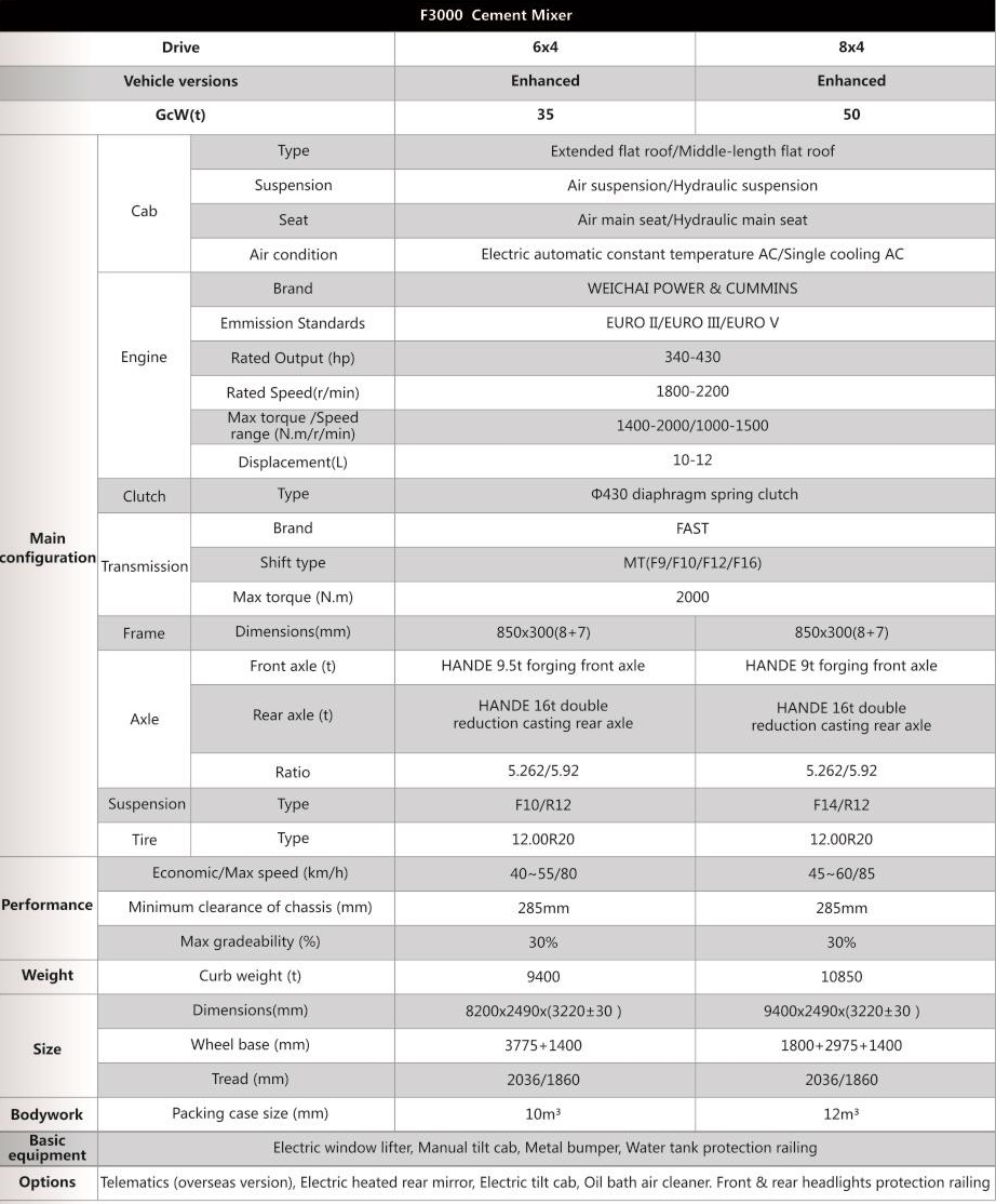 Овај камион доноси шасију Ф3000 серије Схаанки аутомобила, који има чврсти лим и снажан капацитет за утовар. Дизајн равне главе 'олакшава улазак и изаћи из града, избегавајући проблеме мостова по висини. Кабина је опремљена ваздушним јастуцима и седиштима у апсорпцији удара како би се побољшала искуство у вожњи. Горњи монтирани резервоар за мешање и ножеви израђени су од легура челичних и материјала отпорних на хабање, што увелико побољшава радни век резервоара.