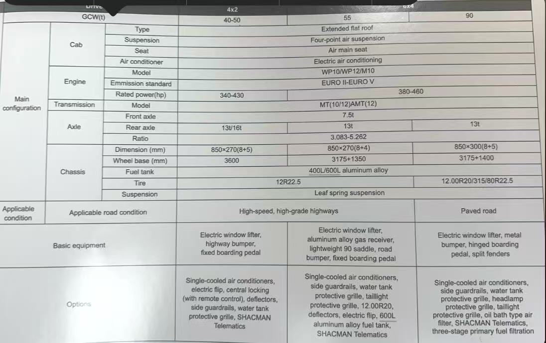 - Осовине и суспензије: Предња осовина усваја технологију МАН 9.5Т, а задња осовина усваја 13Т или 16Т МАН осовине. Систем огибљења усваја челичну плочу за челичну снагу која може да издржи утицај великих оптерећења и обезбеди стабилност и трајност камиона под сложеним условима на путу.