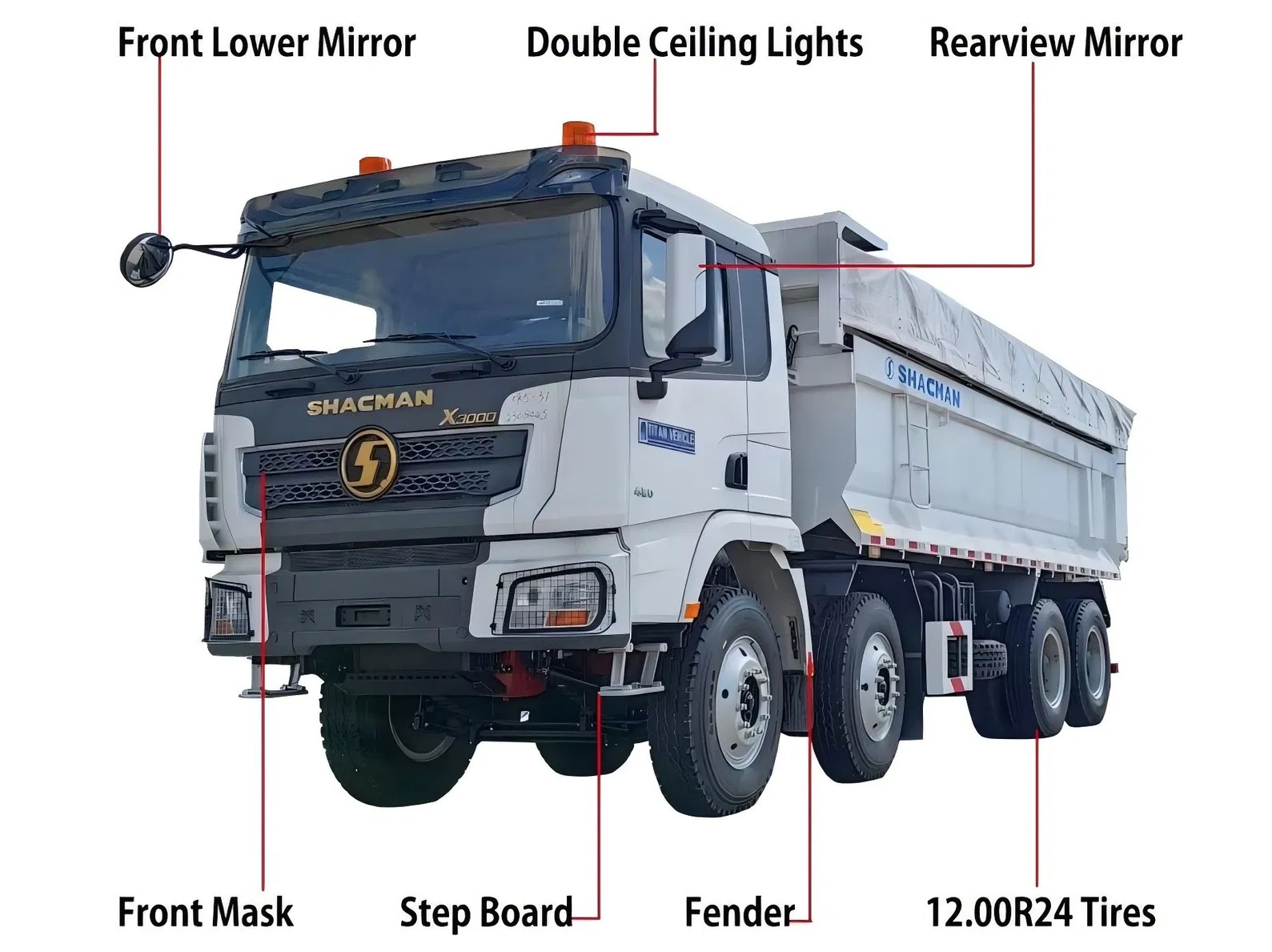 Кабина СхацМан Кс3000 6Кс4 & 8Кс4 Думп камион дизајнирана је уз продужени равни кров или средње дужине равног крова, са ширином 2490 мм, а број дозвољених станара је 2, пружајући пространи и удобан возачки простор. Резервоар за гориво је направљен од алуминијумске легуре, са капацитетима у распону од 300л до 600л, обезбеђујући снабдевање горивом за превоз на даљину. Дозвољено оптерећење предње осовине је 6500кг или 7000кг, а дозвољени оптерећење задње осовине је 18000кг (2-осовинска група), а однос брзине се креће од 5,26 до 5,92, што обезбеђује добру преношење и прилагодљивост добре снаге. Претинац терета су непримесно заварени да би се смањили ризик током рада и повећали радни век услуге. Поред тога, СхацМан Кс3000 6Кс4 & 8Кс4 Думп камион опремљен је напредним сигурносним функцијама као што су АБС систем за кочење против закључавања, ЛДВС систем упозорења о упозорењу ЛДВС ЛАНЕ и ФЦВС Цоллисион Систем упозорења за додатно унапређење сигурности вожње.